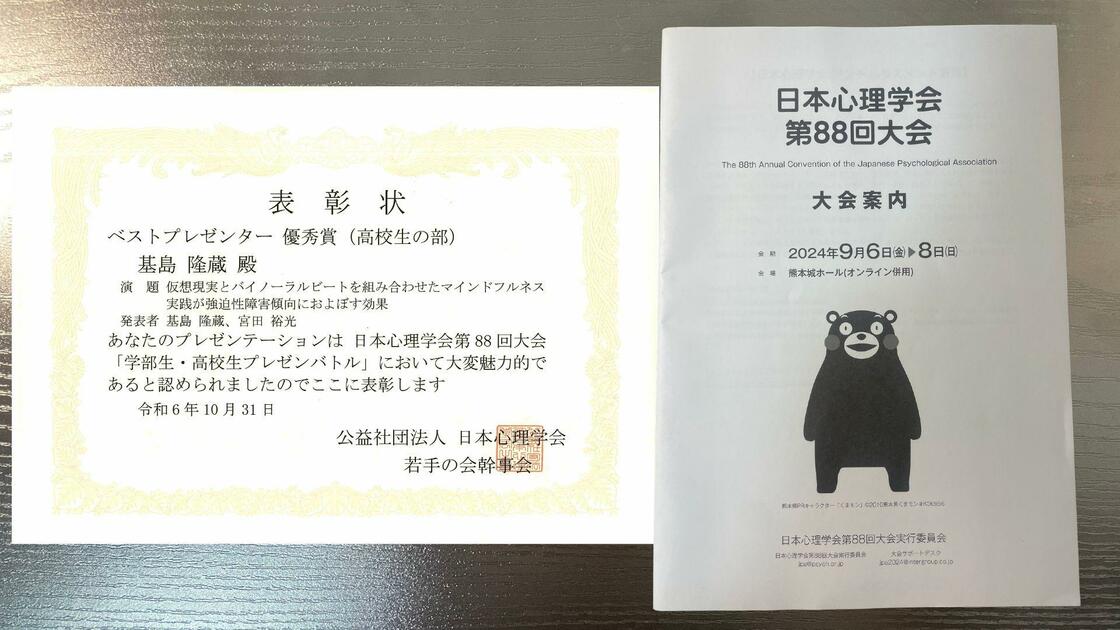 基島 隆蔵・宮田 裕光 (2024). 日本心理学会第88回大会 若手の会企画「学部生・高校生プレゼンバトル」高校生部門賞「仮想現実とバイノーラルビートを組み合わせたマインドフルネス実践が強迫性障害傾向に及ぼす効果」2024年9月7日
