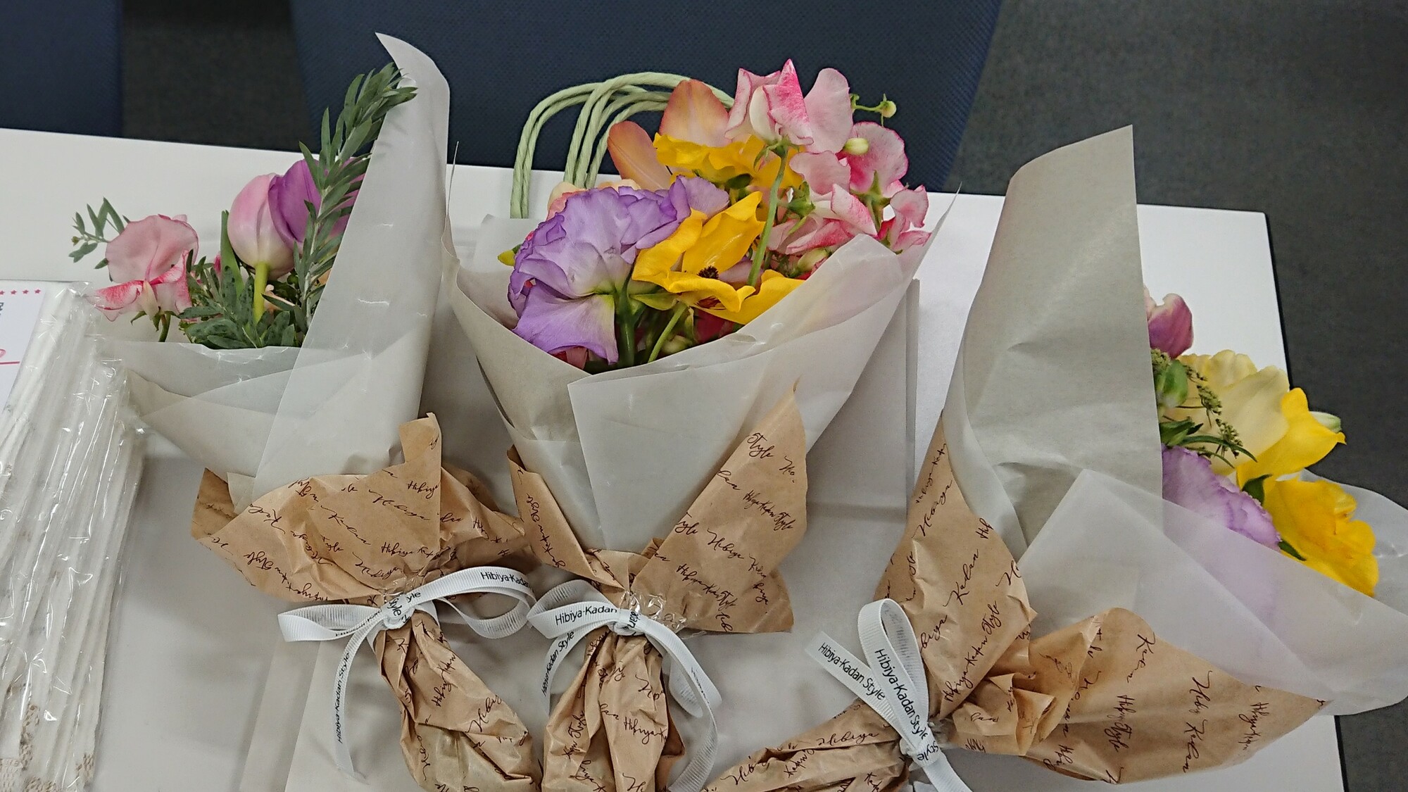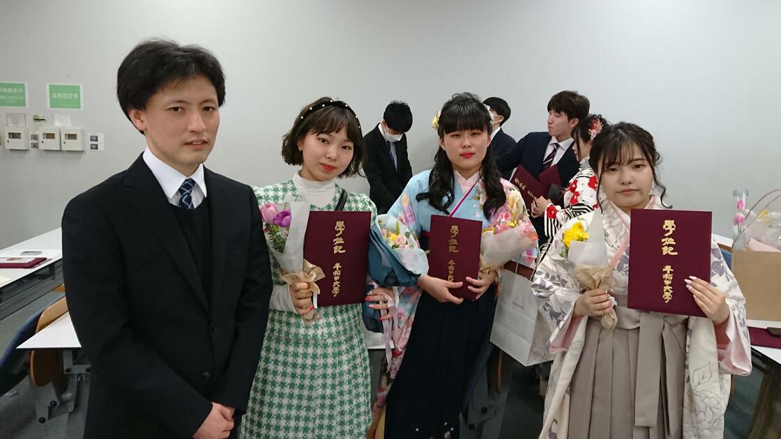 論系の成績上位にノミネートされた他の2名の卒業生の方と合わせて、ささやかながらお花をお贈りし、記念写真を撮らせてもらいました。