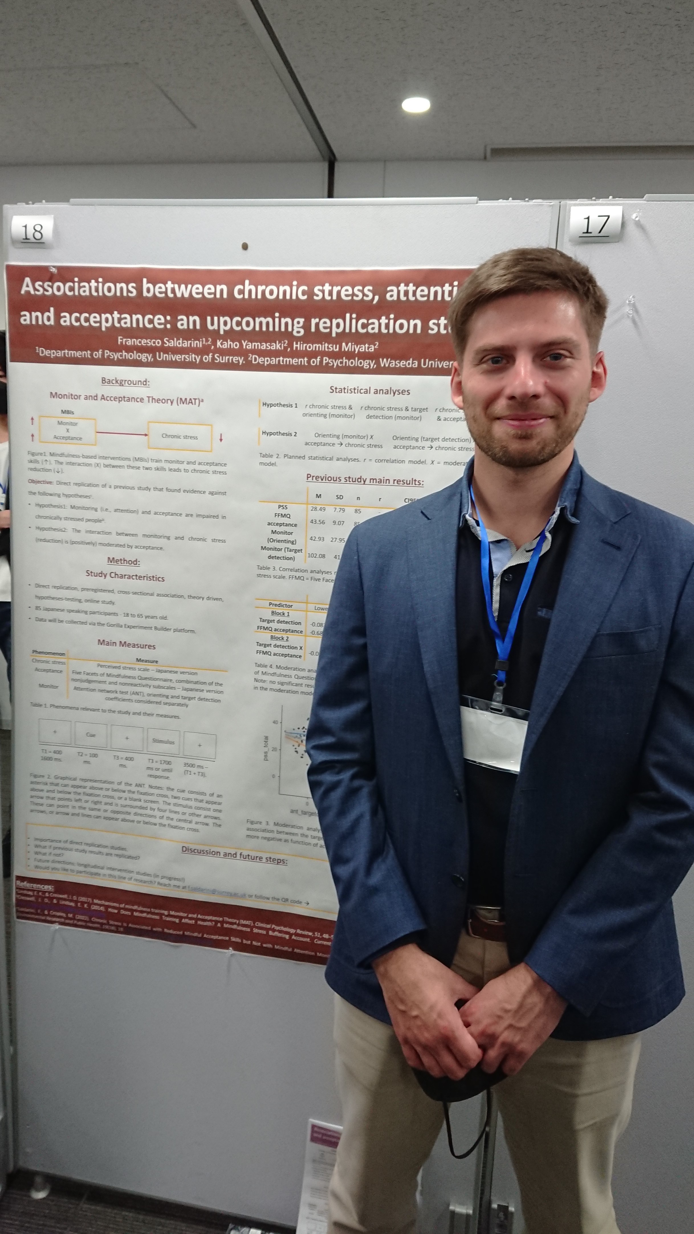 ・ Saldarini, F., Yamasaki, K., & Miyata, H. (2023). Associations between chronic stress, attention, and acceptance: A direct replication study. 13th Society for Tokyo Young Psychologists. Poster 18. Conference Room 1, Toyama Campus, Waseda University. March 11, 2023 (in English) (優秀発表賞 [博士課程の部] 受賞)