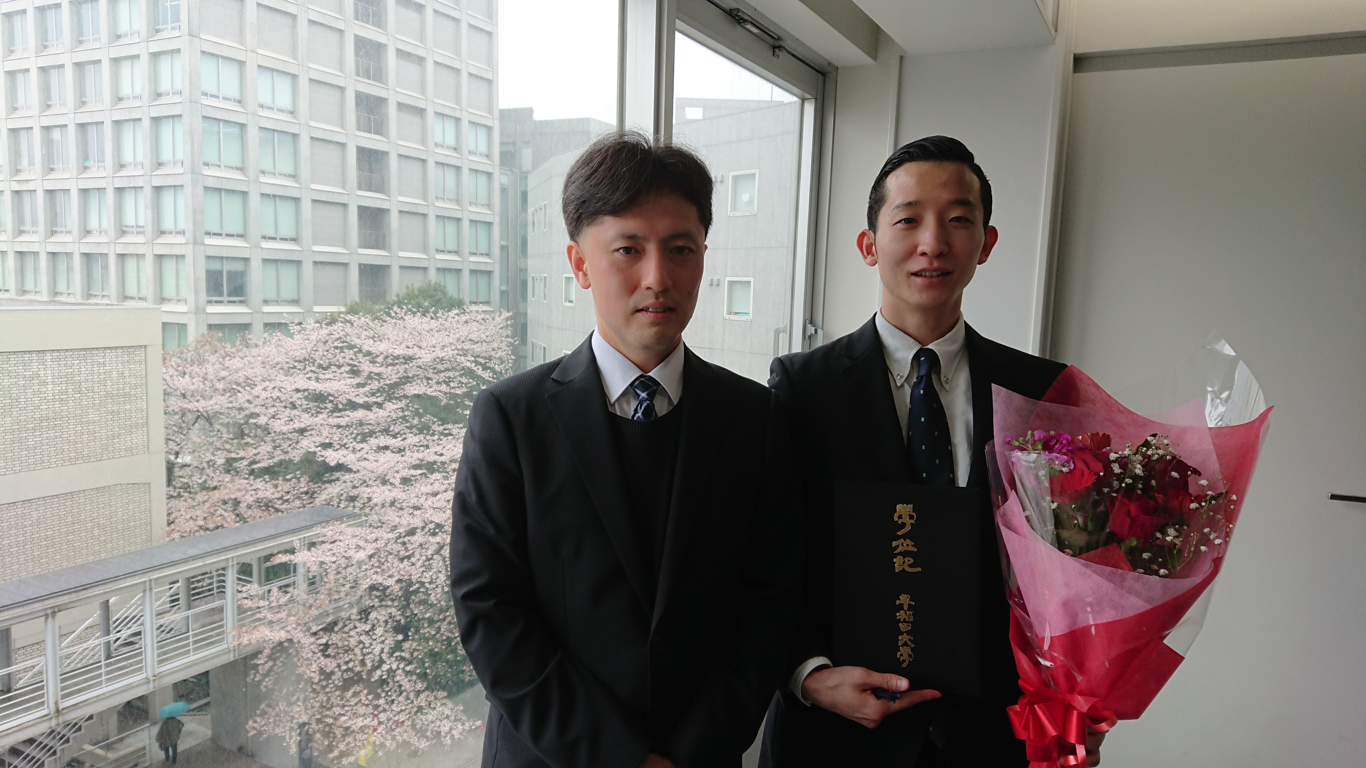 3月25日の12時から、大学院文学研究科の修了生の学位授与式が行われました。大学院生が修了するのはこの研究室では今年が初で、修士2年生の小林大介さんが修了されました。3年生からも、名前入りボールペンのプレゼントがありました。